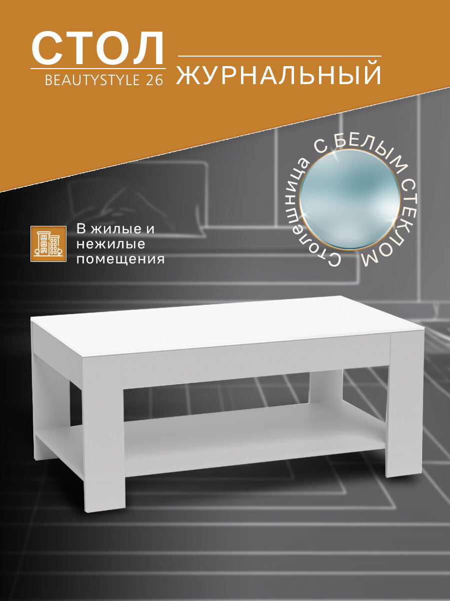Стол журнальный BeautyStyle 26 вполне может выполнять функцию рабочего стола современного творческого человека. При его внушительных размерах 60*110см только высота в 46см его отличает от полноценного письменного стола. Кроме большой рабочей поверхности, у стола есть удобная очень вместительная полка для книг, журналов, гаджетов, прочих мелочей. На таком столе можно легко сервировать завтрак, или легкий ужин. Этот стол будет уместен в гостиной, оформленной в современном строгом стиле.