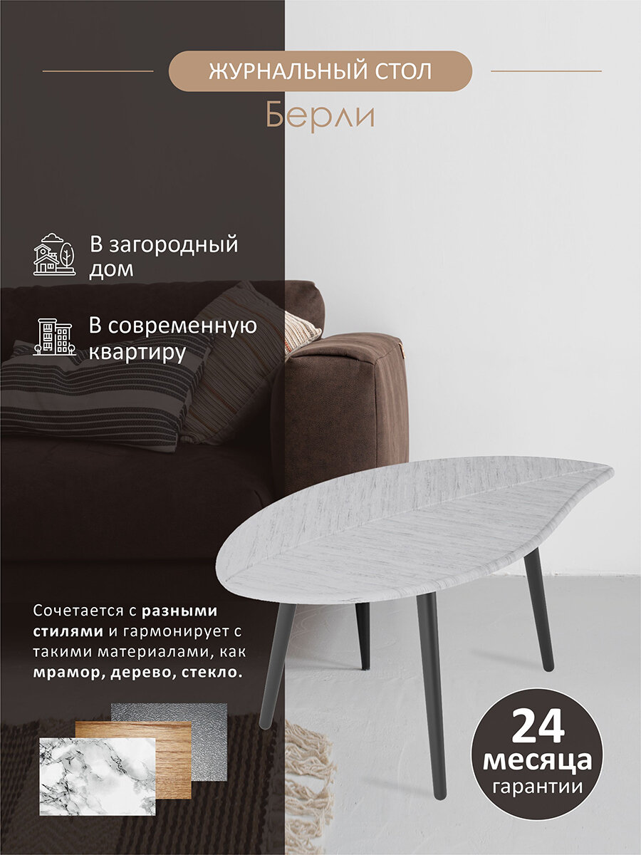 Журнальный стол вносит в интерьер гостиной комфорт и подчеркивает его эстетику. Зачастую подобный столик бывает главным столом в доме. Он помогает хозяевам встречать гостей, работать. Особенностью дизайнерского решения журнального стола "Берли" является оригинальное сочетание фрезеровки столешницы в форме листа дерева и текстуры декоративного покрытия.