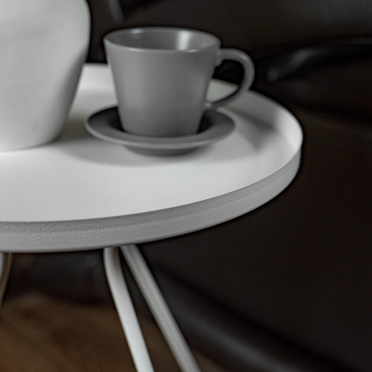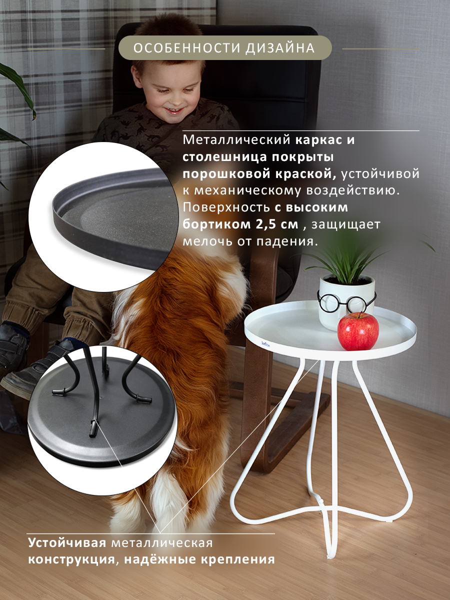 Устойчивый И надежный Надежный металлический каркас и столешница окрашены порошковой краской, устойчивой к механическому воздействию. Высота столика 450 мм. Диаметр столешницы 350 мм. Каркас выполнен из трубы диаметром 10 мм. Максимальная статическая нагрузка на столик 5 кг.
