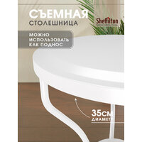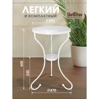 диаметр столешницы 350 мм; каркас выполнен из трубы диаметром 10 мм; максимальная статическая нагрузка на столик 5 кг; материал чаши в основании столика: пластик; столешница снимается и ее можно использовать в качестве подноса