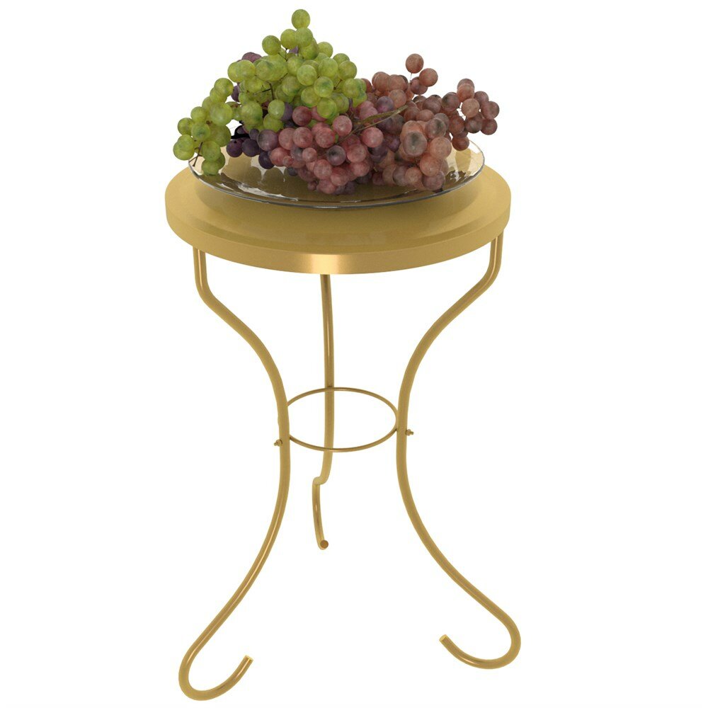 диаметр столешницы 350 мм; каркас выполнен из трубы диаметром 10 мм; максимальная статическая нагрузка на столик 5 кг; материал чаши в основании столика: пластик; столешница снимается и ее можно использовать в качестве подноса