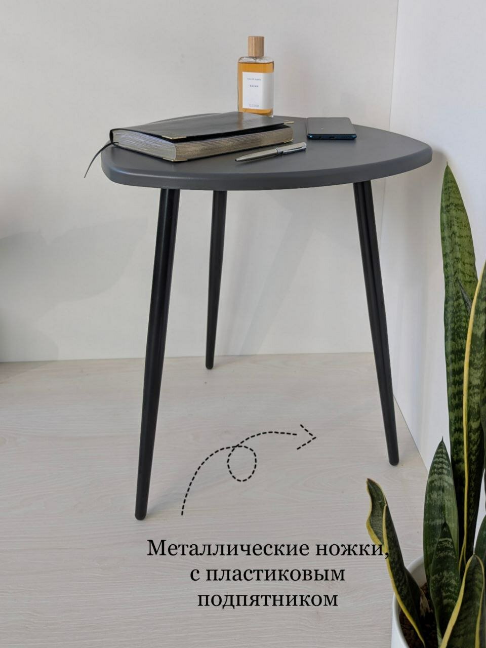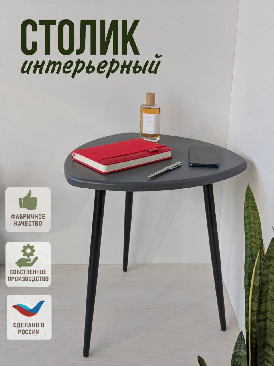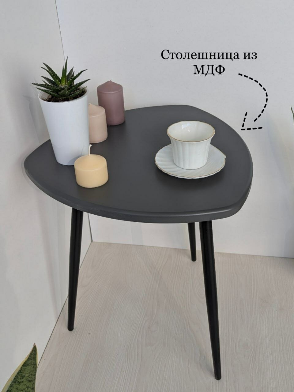 Столик журнальный треугольный, длина сторон 47х47х47см, цвет: серый графит, на черных металлических ножках-конус.: сравнение цен, характеристики, фото, актуальное наличие и цены.