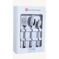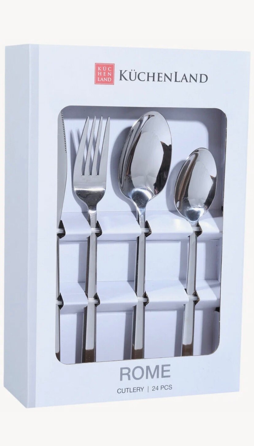 Столовые приборы, 24 пр. Материал: нержавеющая сталь. Комплектация: 6 столовых ножей, 6 столовых вилок, 6 столовых ложек, 6 чайных ложек. Рекомендуется мыть вручную во избежание появления царапин на поверхности приборов. Можно мыть в посудомоечной машине.