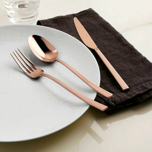 Набор столовых приборов на 6 персон, от итальянской фабрики Sambonet, серия Rock. Цвет - медный. В комплекте 24 предмета: 6 столовых ножей, 6 вилок, 6 столовых ложек и 6 чайных ложек.