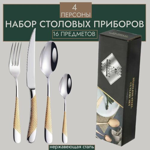 Набор столовых приборов на 4 персоны, представляет собой 16 предмета, состоящий из 4 вилок, 4 чайных ложек, 4 столовых ложек и 4 ножей.