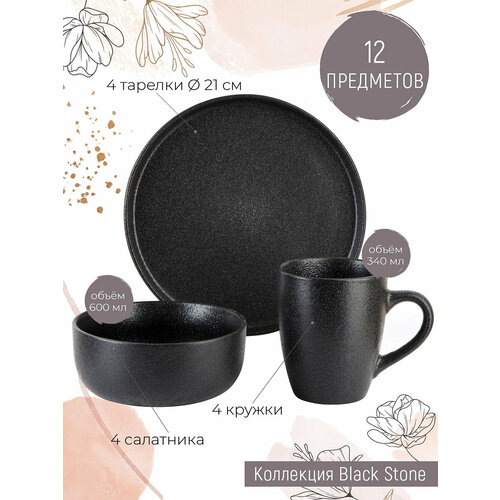 Столовый сервиз черный матовый 12 предметов, на 4 персоны "Black Stone", Nouvelle
