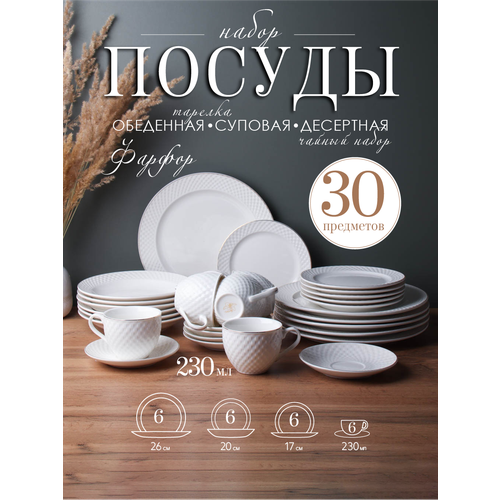 Столовый набор посуды 30 предметов/ Тарелки с чайным набором Фактурный белый с золотом: сравнение цен, характеристики, фото, актуальное наличие и цены.
