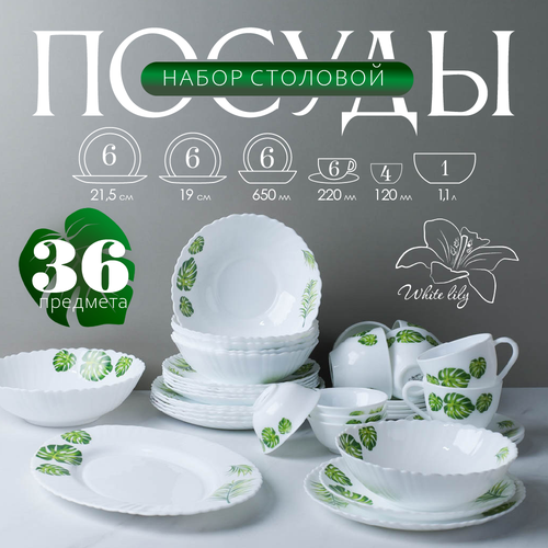 Набор посуды станет прекрасным дополнением к вашему обеденному столу или праздничному ужину. Классический белый цвет, и листья монстеры придают этой посуде особый шарм и изысканность. Она будет радовать глаз и создавать уютную атмосферу во время семейных обедов или торжественных мероприятий.