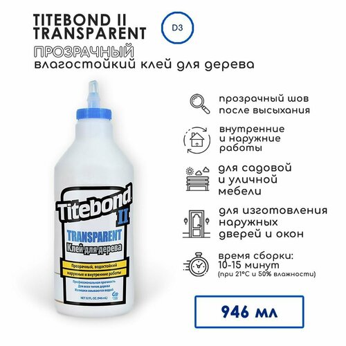 TITEBOND II Transparent Premium Wood Glue - однокомпонентный клей. Он идеален для наружного применения, включая садовую и уличную мебель, скворечники, почтовые ящики, столы для пикника и т. д. Образует прозрачный клеевой шов, может применяться для монтажа плавающих деревянных и ламинатных полов типа шип-паз, включая подогреваемые полы, основанные на системе лучистого нагрева.