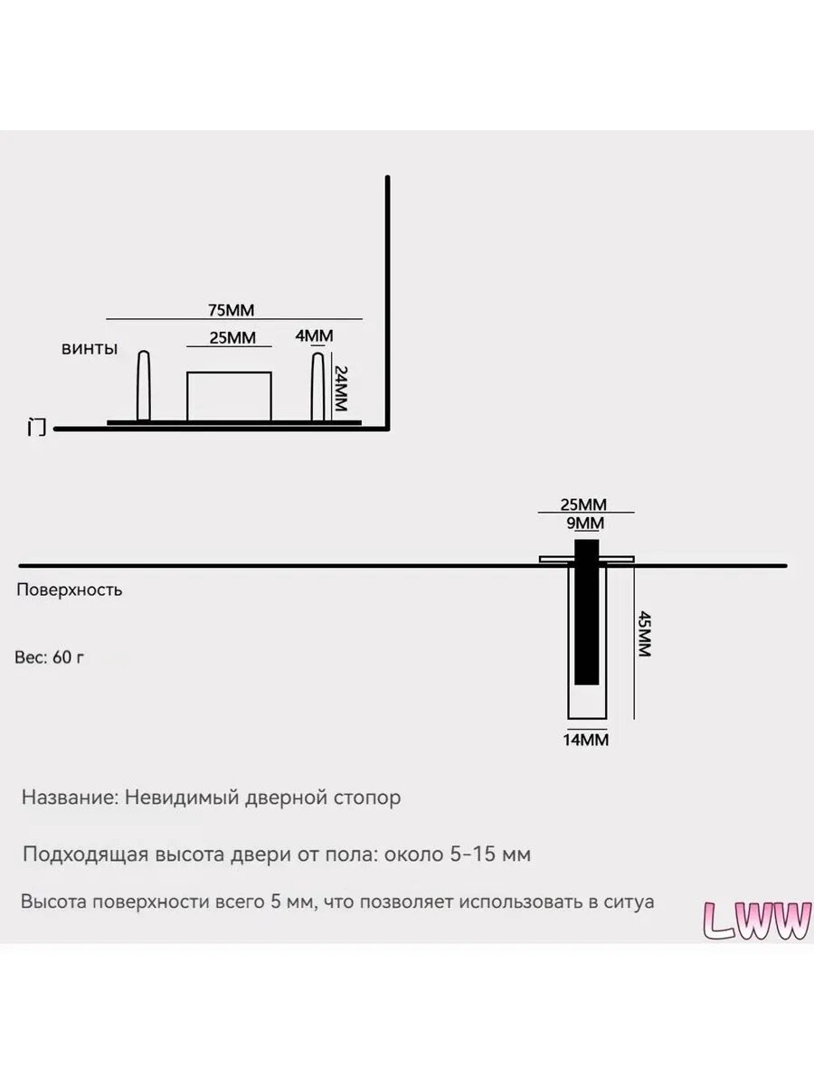 подходит для любых напольных покрытий: ламинат, паркетная доска, плитка, ковровые покрытия; глубина монтажа в напольное покрытие - 45 мм, в дверь 25 мм