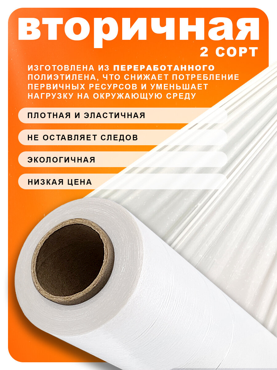 Пленка произведена из качественного вторичного сырья –Вторичка (2 сорт) произведена из вторичного сырья - переработанного полиэтилена. Имеет вкрапления, помутнения, легкий, специфичный переработанному сырью, запах и сероватый оттенок. Пленка липкая и клейкая, липнет только сама к себе, не оставляет после себя клеевых следов и образует плотный защитный слой при наматывании.
