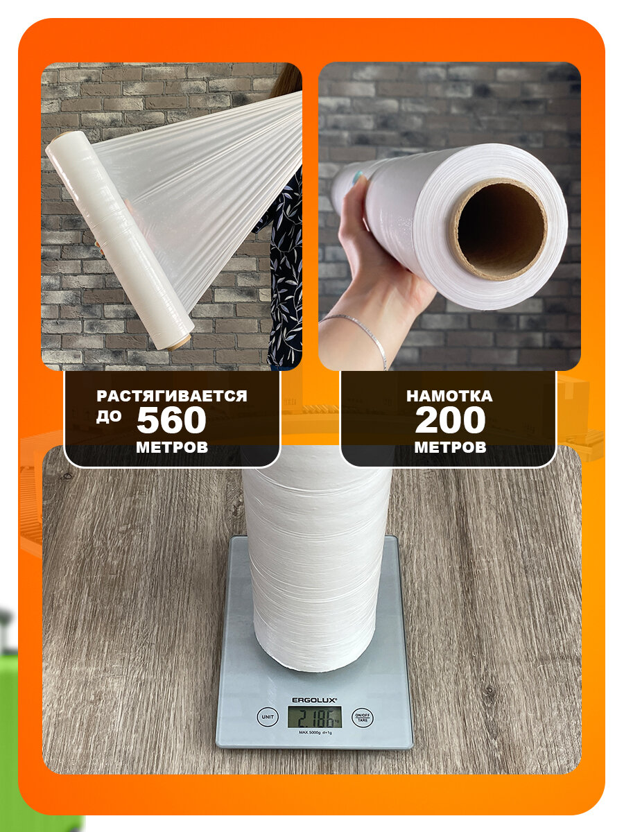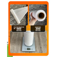 Пленка имеет плотность 23 микрона, Ширина пленки составляет 50 см, а длина без растяжения – 200 метров, растягивается до 560 метров.