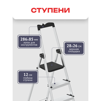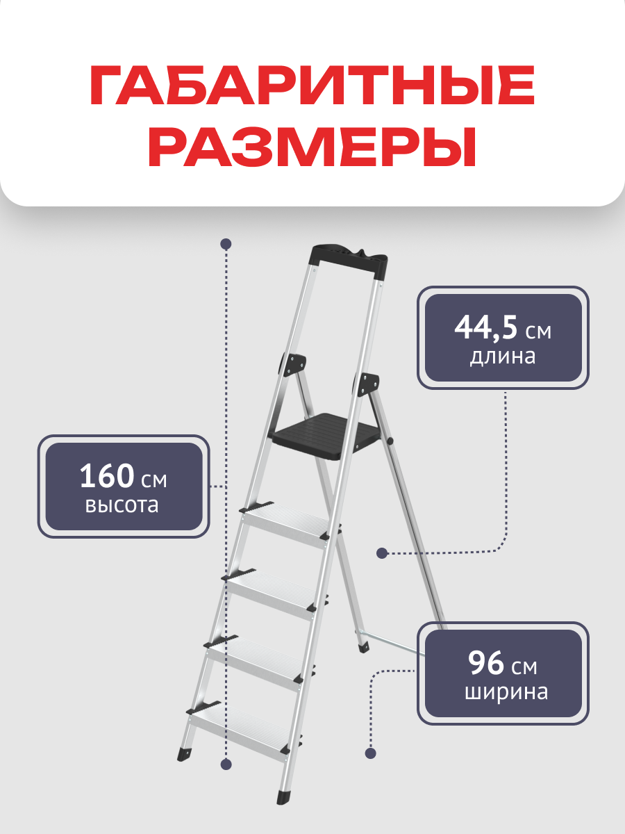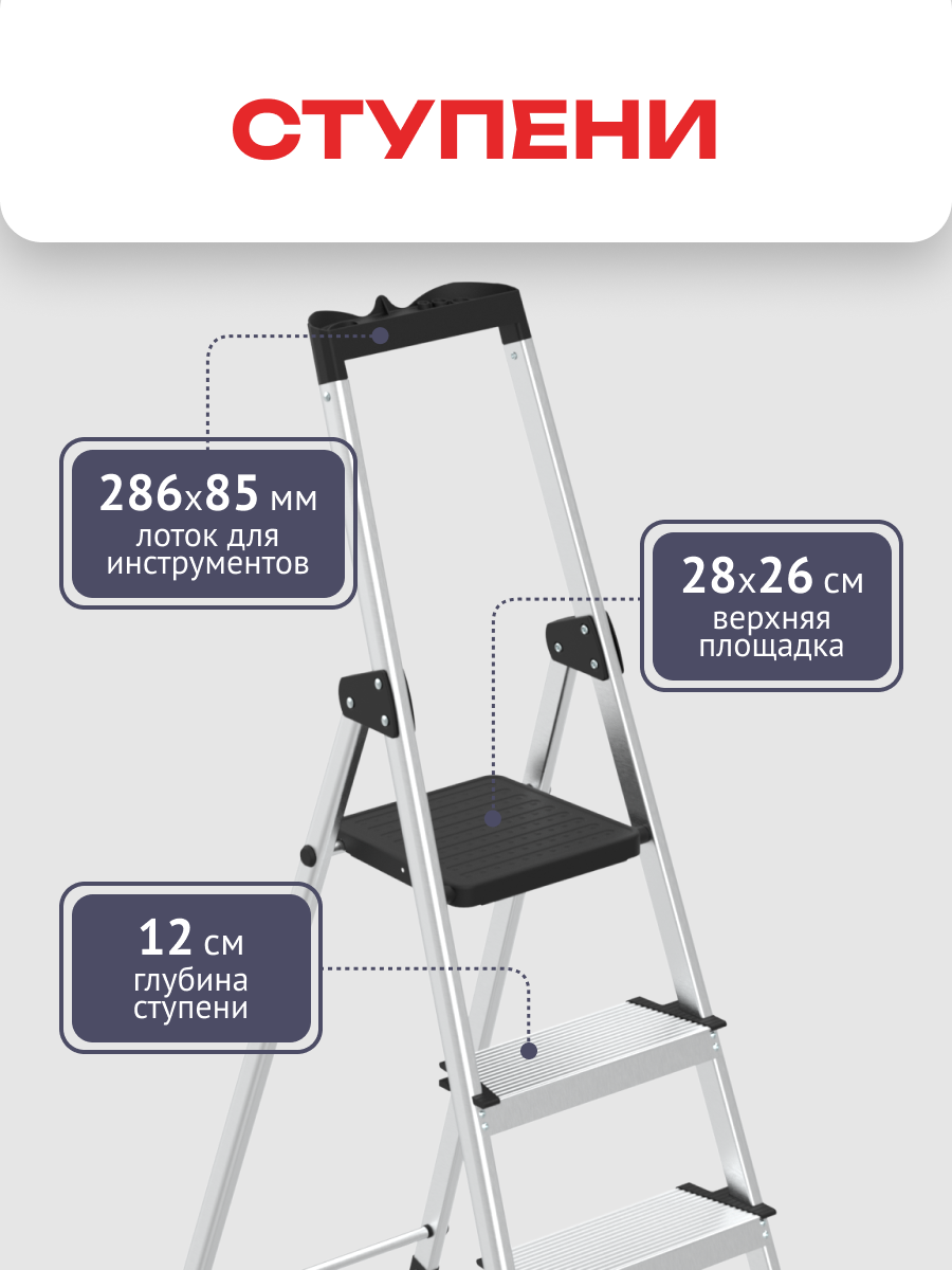 Насадки на ножках и максимальная нагрузка Насадки на ножках обеспечивают стабильность и безопасность при использовании. Максимальная нагрузка на лоток составляет 5 кг, а на всю стремянку – 150 кг.