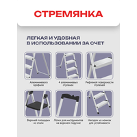 Алюминиевый профиль и ступени Алюминиевый профиль в сочетании с алюминиевыми ступенями делает стремянку легкой и удобной в использовании. Рифленая поверхность ступеней шириной 12 см обеспечивает надежное сцепление и безопасность при работе.