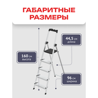 Размеры и вес В разложенном виде стремянка имеет размеры 44,5x96x160 см и вес 4,46 кг. Расстояние от пола до верхней площадки составляет 110 см, а максимально достижимая высота – 310 см.