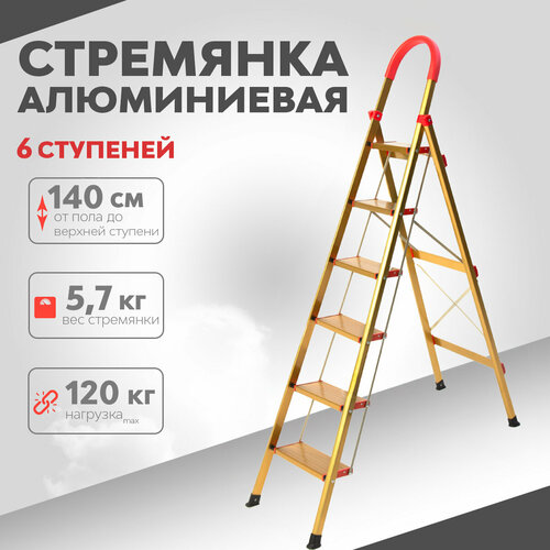 Стремянка из усиленного алюминия Gold 6 ступеней — надёжная конструкция и усиленный каркас, она идеально подойдёт как для использования дома, так и для выполнения любых работ. Стремянка имеет прочную конструкцию с удобными по ширине ступеньками, мягкими резинопластиковыми ножками, не оставляющих следов на полу. А так же приятный и необычный цвет усиленного алюминия Gold.