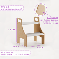 Детская подставка для ног - универсальный помощник в доме, где растёт малыш. Это и ступенька для ванной, чтобы самостоятельно умываться и чистить зубы. Это и стремянка в детскую комнату или гардероб, чтобы без помощи родителей доставать одежду и игрушки с полки. Это и опора под ноги при сидении на унитазе. Деревянный табурет также можно использовать как стул или даже столик для рисования. С таким помощником ваш ребёнок станет более самостоятельным и уверенным в своих действиях, что очень ценно для детей в возрасте от 1 года. Подставка Монтессори имеет устойчивую и надёжную конструкцию. По бокам стремянки расположены ручки, с помощью которых малышу легко и безопасно подниматься и спускаться. Они же служат ограничителями по краям, чтобы ребенок случайно не соскользнул в сторону. Детская ступенька выполнена из качественной березовой фанеры высшего сорта, которая обеспечивает прочность, экологичность и бессрочный срок службы деревянного изделия. Товар сертифицирован.