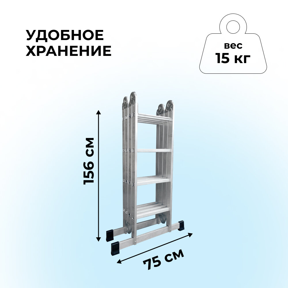 Эта стремянка имеет три секции, которые можно использовать как отдельные лестницы или как приставные, что делает ее универсальной и многофункциональной. Она подходит для различных задач: от уборки до ремонта. Благодаря компактным размерам в сложенном виде, ее удобно хранить дома или в гараже.