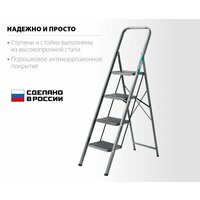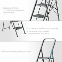 стальная конструкция, противоскользящие накладки на ступенях, антикоррозионное покрытие, пластиковые наконечники на ножках, дуга безопасности, максимальная нагрузка 150 кг, ширина лестницы 40,8 см, глубина ступеней 195 мм, вес 8,7 кг