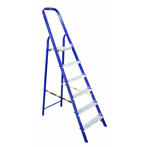 Стремянка стальная 6 ступеней Профиль: стальной окрашенный Ступень: алюминиевая Площадка: стальная оцинкованная Нагрузка до 150 кг Высота от пола и до площадки - 1,23м (123см) Общая высота стремянки –2,00м Вес стремянки – 6,6 кг Ширина стремянки -0,49м Профиль размеры 40х20х0,7 и 33х20х0,7мм Шаг между ступенями у стремянок - 230мм Глубина ступени стремянки -80мм