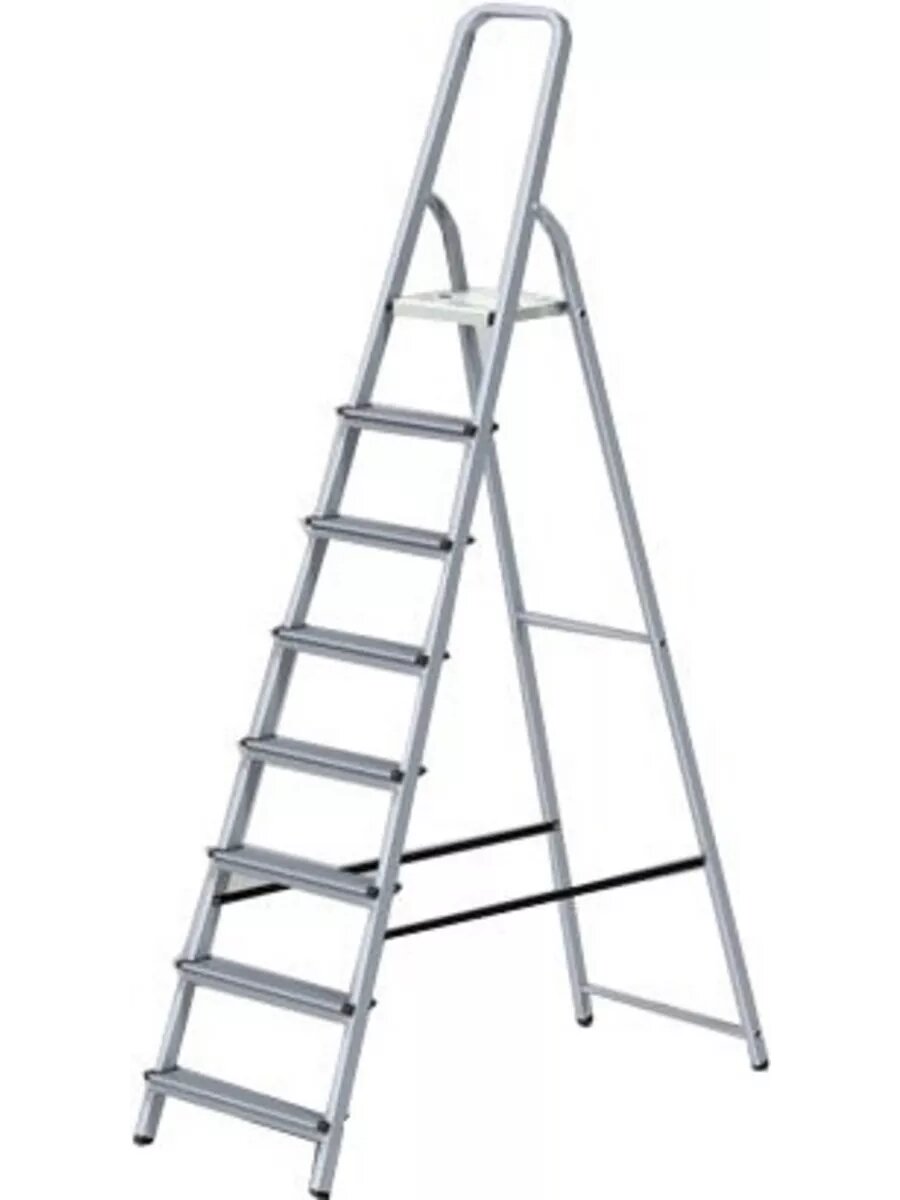 Лестница-стремянка алюминиевая односторонняя 169 см 5,4 кг STARTUL (ST9940-08) с высотой до площадки - 169 см, общей высотой - 242 см; макс. нагрузкой - 150 кг. Прочный алюминиевый профиль, надежное соединение ступеньки с профилем, нескользящая рифленая площадка и ступени, нескользящие башмаки, малый вес. Технические преимущества: - имеет высокую прочность и надёжность при небольшом весе изделия; - легко устанавливается и обеспечивает высокий уровень комфорта; - ступени и стойки из прессованных алюминиевых профилей; - широкие ступени глубиной 80 мм; - рифлёная поверхность ступеней способствует безопасному подъёму и спуску; - прочное крепление ступеней к боковинам 6 заклёпками придаёт конструкции высокую устойчивость; - рифлёная площадка из оцинкованной стали; - дуга безопасности 600 мм; - прочные страховочные ремни; - опорные наконечники из прочного пластика обеспечивают устойчивое положение; - компактность при хранении и транспортировке; - практичность и внимание к каждой детали гарантируют безопасность работы на любой высоте.