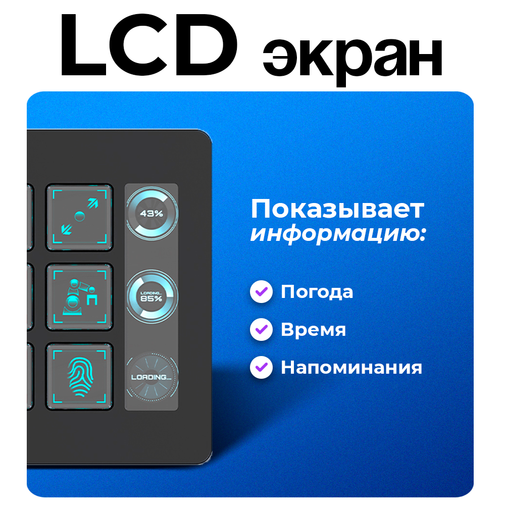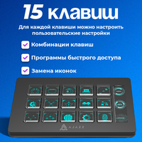 Основные характеристики: 15 программируемых клавиш, которые позволяют настроить выполнение часто используемых команд или действий одним нажатием кнопки. Иконки настраиваются под индивидуальный стиль. Макропрограммирование: Возможность записи сложных последовательностей нажатий клавиш для автоматизации рутинных задач. Панель управления настольным помощником: Легко управляйте всеми функциями вашего компьютера прямо с клавиатуры. Эргономичный дизайн: Удобные клавиши обеспечивают комфорт при длительной работе. Подключение через USB-порт: Простое подключение к компьютеру.