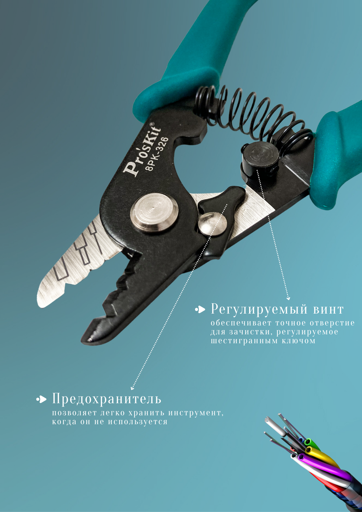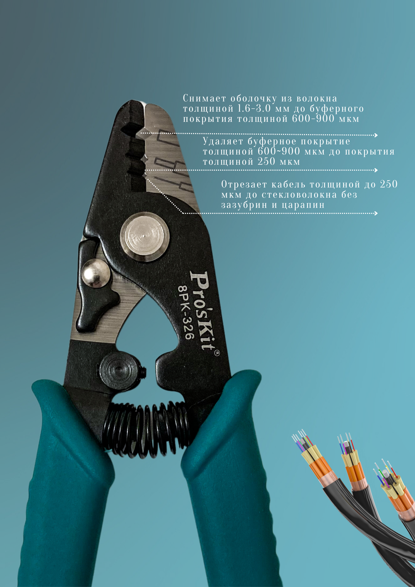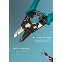 Возможность работы с покрытием любого диаметра. Инструмент оснащён тремя пазами под буферные покрытия различного диаметра. Возможна тонкая ручная настройка. Отсутствие зазубрин и царапин на стекловолокне. Стриппер зачищает стекловолокно с изоляцией от 125 мкм до 3 мм без повреждений и царапин. Длительное сохранение остроты заточки. Инструмент изготовлен из углеродистой стали высокой твёрдости, что обеспечивает длительное сохранение остроты заточки. Упрощение работы и повышение производительности. Стриппер оснащён возвратной пружиной, что упрощает работу и повышает производительность. Точное позиционирование для снятия изоляции. Винт регулируется с помощью шестигранного ключа, что обеспечивает более точное позиционирование.