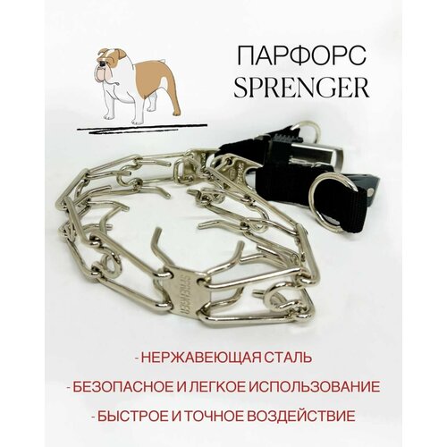 Парфорс (строгий ошейник) Herm.SPRENGER изготовлен из хромированной, нержавеющей стали и застежки – фастекс, шириной 3,2 см, закреплена к конечным стальным пластинам синтетической тесьмой шириной 3,2 см. Сталь 3 мм. Особенностью ошейника является центральное расположение металлической застежки - фастекс, позволяющей добиться оптимального положения ошейника на собаке. Ошейник одевать безопасно и просто благодаря замку клик-клок. На застежке имеется защита во избежание растегивания ошейника. Сварные стальные кольца позволяют крепко зафиксировать ошейник к поводку строго по центру. Конструкция ошейника позволяет убирать и добавлять его звенья в зависимости от размера шеи собаки. Ошейник предназначен для собак от 20 кг.