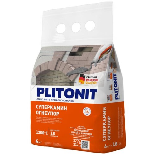 PLITONIT СуперКамин ОгнеУпор раствор с армирующими термостойкими волокнами для кладки огнеупорных шамотных кирпичей, оштукатуривания и ремонта печей, каминов и дымоходов. Для наружных и внутренних работ. Низкий расход. Отсутствие необходимости смачивать кирпич. Долговечность - коэффициент расширения раствора соответствует коэффициенту расширения шамотного кирпича. Марка по термостойкости Т20. Максимальная крупность зерен наполнителя — 1,2 мм. Рекомендуемая толщина кладочного шва — 3-4 мм. Толщина штукатурного слоя за одно нанесение — до 10 мм. Предназначен для кладки огнеупорных шамотных кирпичей, оштукатуривания и ремонта печей, каминов, мангалов и дымоходов внутри и снаружи помещений. Обладает высокой технологичностью и водоудерживающей способностью, а также водостойкостью, трещиностойкостью и низким расходом материала. Максимальная фр наполнителя – 1,2 мм. Рекомендуемая толщина кладочного шва 3-4 мм. Толщина штукатурного слоя за одно нанесение – до 10 мм. Фасовка – 4 кг. Условия проведения работ: При проведении работ и в течение последующих 7 суток после их окончания необходимо обеспечить поддержание температуры воздуха и кирпичей в пределах от +5 °С до +30 °С. Температура растворной смеси в процессе проведения работ – от +10 °С до +30 °С. Подготовка основы: Поверхность шамотных кирпичей должна быть сухой и очищенной от грязи, пыли, масел, жиров, всех видов красок, глиняного и цементного раствора. Шамотный кирпич не должен иметь трещин, раковин, вкраплений камней и других посторонних материалов; обладать правильной формой, при постукивании издавать звонкий и чистый звук. При оштукатуривании наружных стен имеющиеся трещины, сколы и выбоины предварительно заделать ремонтным составом плитонит СуперКамин ТермоРемонт. Приготовление растворной смеси: Для затворения сухой смеси использовать воду из питьевого водоснабжения. Соотношение при смешивании: на 1 кг сухой кладочной смеси требуется 0,24-0,32 л воды (4,8-6,4 л на 20 кг). Кол-во воды использовать исходя из получаемой консистенции раствора в рамках указанного диапазона. Сухую смесь засыпать в заранее отмеренное количество воды и перемешать в течение 2-3 минут с помощью электромиксера или электродрели с насадкой с частотой вращения не более 600 об/мин до получения однородной консистенции. Дать растворной смеси отстояться 10 минут и повторно перемешать. При повторном перемешивании разрешается добавление воды до максимального значения вышеуказанного соотношения. Время использования готовой растворной смеси – не более 4-х часов. Порядок работы: Кладка печи. Для создания монолитной и прочной конструкции стены кладку необходимо выполнять с перекрытием вертикальных швов в смежных рядах за счет смещения их на половину или четверть кирпича. Перед укладкой каждого ряда необходимо произвести раскладку кирпича без раствора («насухо»). Раствор укладывается и разравнивается по площади, равной плоскости кирпича. На нанесенный раствор укладывается кирпич и выравнивается нажатием руки или постукиванием рукояткой кельмы. При укладке каждого последующего в ряду кирпича на его торцевую часть также наносится раствор. Для снижения расхода материала и равномерного распределения растворной смеси по всей площади кирпича рекомендуется применять зубчатый шпатель. Во время кладки внутренние и нар