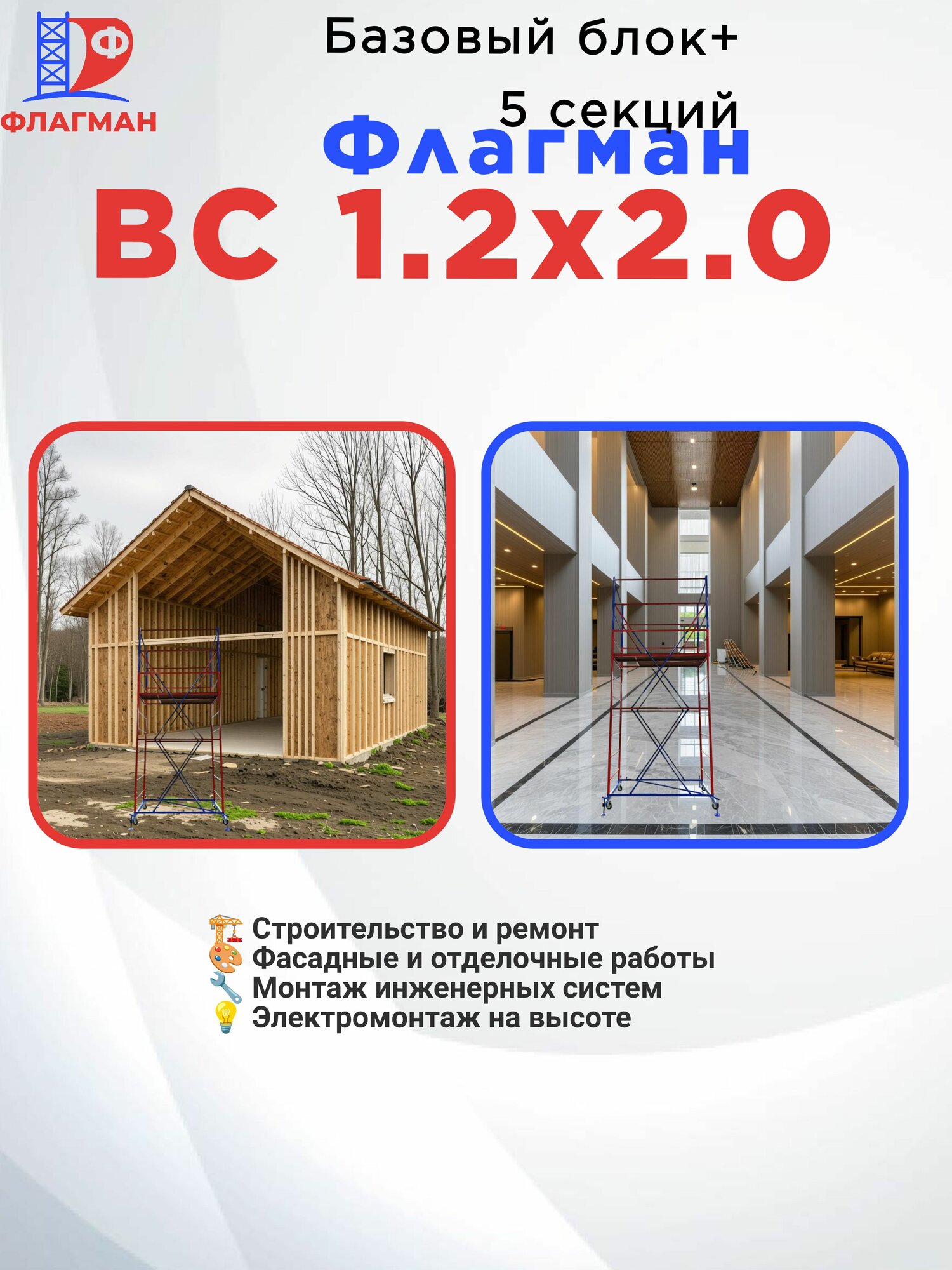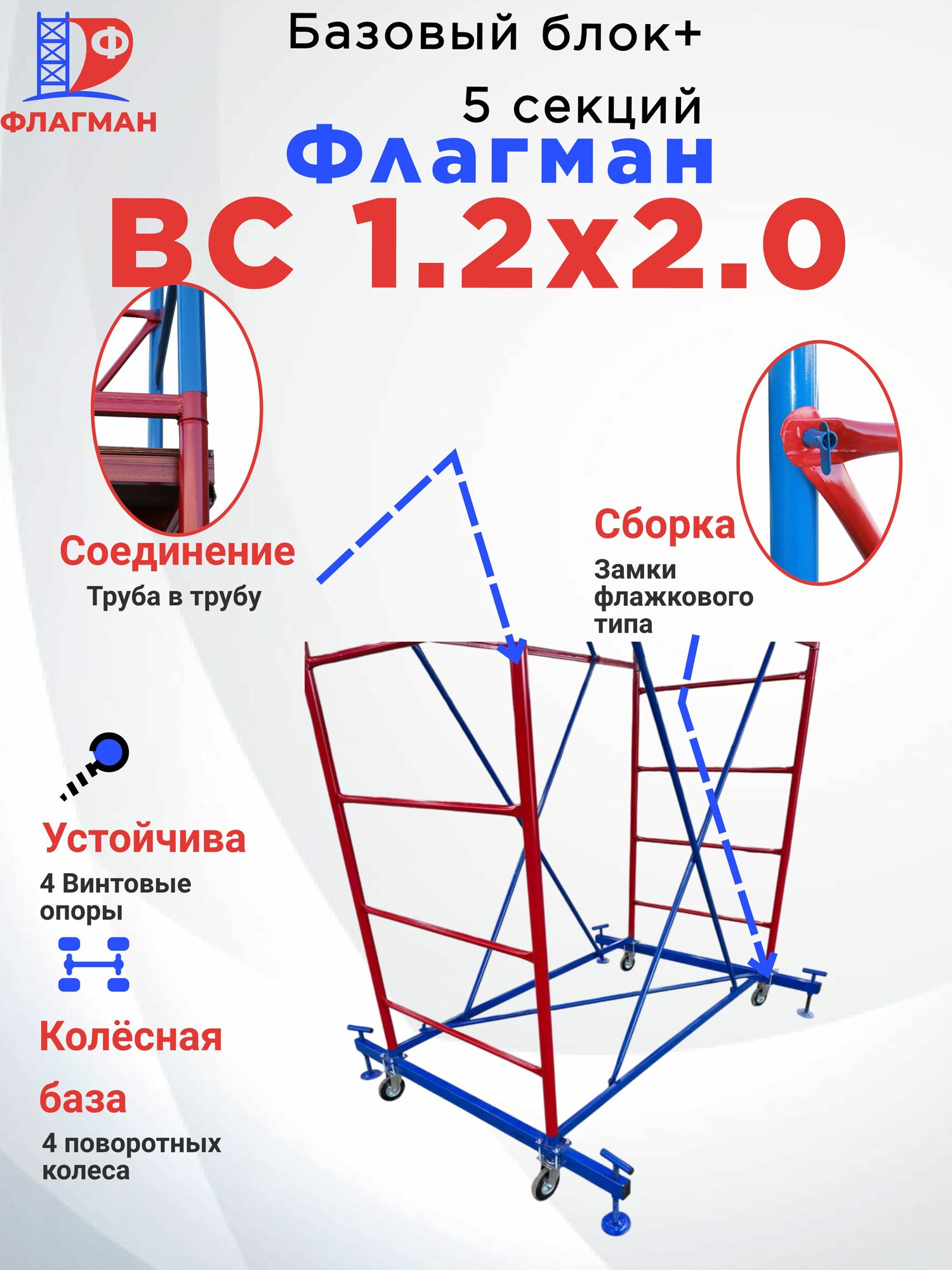 - Мобильность и устойчивость: колёсная база с винтовыми опорами позволяет легко перемещать вышку и точно выставлять её на неровной поверхности.