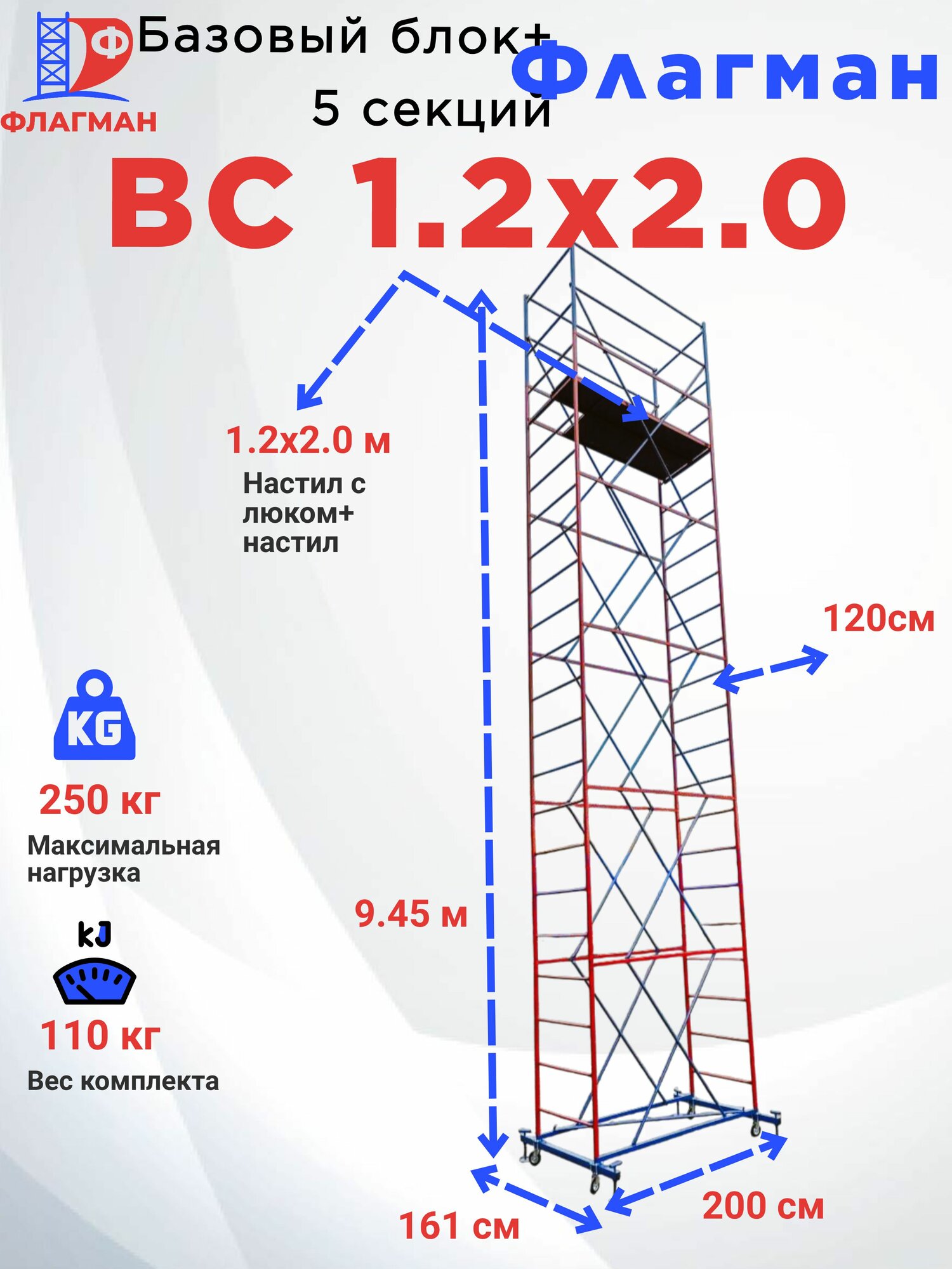 Вышка строительная «флагман ВС-250-1.2» (5 секций, 9,45 м)
