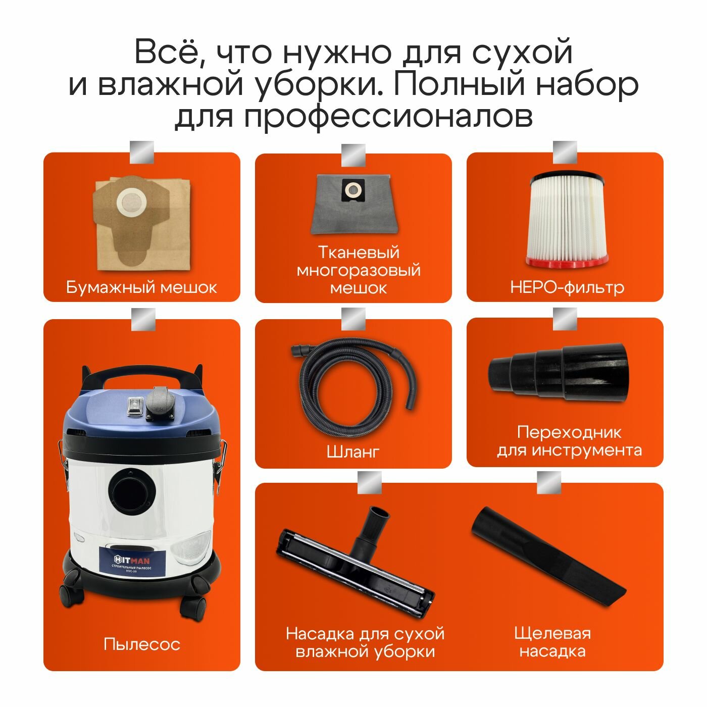 Строительный пылесос, промышленный, электрический Hitman( 1600 Вт, 20 литров, сухая/влажная уборка ): сравнение цен, характеристики, фото, актуальное наличие и цены.