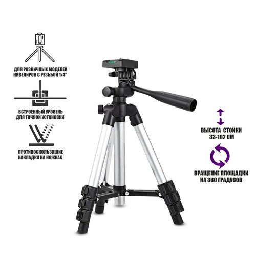 Строительный штатив для установки лазерного уровня позволяет зафиксировать устройство на высоте до 102 см. Универсальный строительный штатив подходит для различных моделей нивелиров, которые имеют резьбу крепления 1/4". Стойка для лазерного уровня имеет компактную и легкую конструкцию и занимает минимум места среди остального оборудования геодезиста. Стойка для нивелира имеет складную конструкцию, что позволяет легко транспортировать ее в любое место. Строительный штатив регулируется по высоте, возможен поворот на 360 градусов. Встроенный пузырьковый уровень поможет точно настроить штатив в нужном положении. Нескользящие резиновые накладки на ножках могут вращаться, а при необходимости сниматься для более устойчивого положения штатива, например на земле.