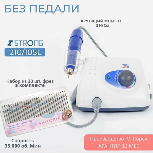 Strong 210/105L без педали в сумке. С гарантией 1 год в официальных сервисных центрах по всей России. Производство Юж. Корея. Укомплектован набором наиболее часто используемых фрез для маникюра и обработки кутикул 30шт в упаковке.