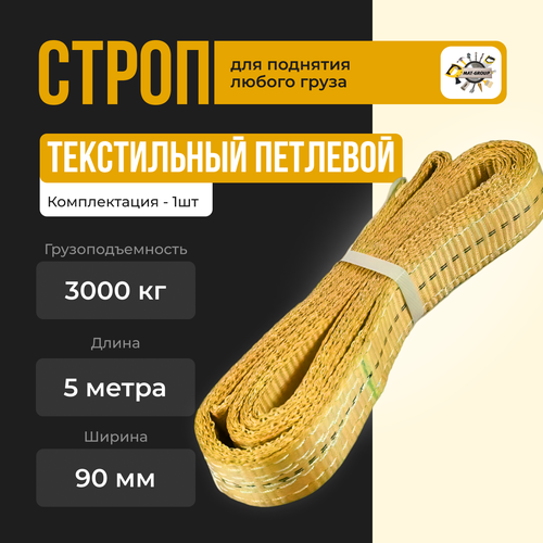Основные характеристики стропа включают его грузоподъемность, которая составляет 3 тонны, и длину в 5 метров. Ширина стропа составляет 9 см, что делает его удобным для использования в различных условиях.