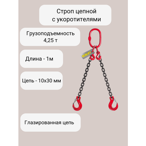 Строп оснащен цепью 10 х 30, 8 класса (Т8), что обеспечивает высокую прочность и долговечность. Длина стропа составляет 1 метр, что позволяет использовать его для работы с грузами различного размера.