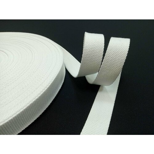 Текстильная лента (стропа) белого цвета, шириной 25 мм изготавливается из круглых, крепких синтетических нитей, которые визуально и тактильно не отличаются от хлопка, поэтому эту стропу часто называют хлопковой, а нитку называют искусственный хлопок, которая обладает свойствами: