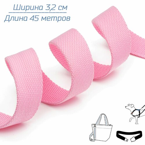 Текстильная лента ременная (стропа) розового цвета, шириной 32 мм изготавливается из круглых, крепких синтетических нитей, которые визуально и тактильно не отличаются от хлопка, поэтому эту стропу часто называют хлопковой, а нитку называют искусственный хлопок, которая обладает свойствами: