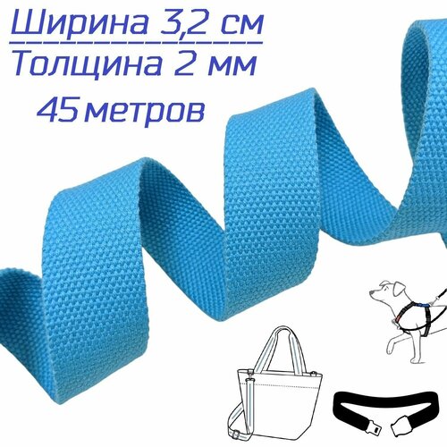 Целая катушка текстильной ременной ленты (стропа) цвета светлая (яркая) морская волна, шириной 32 мм изготавливается из круглых, крепких синтетических нитей, которые визуально и тактильно не отличаются от хлопка, поэтому эту стропу часто называют хлопковой, а нитку называют искусственный хлопок, которая обладает свойствами: