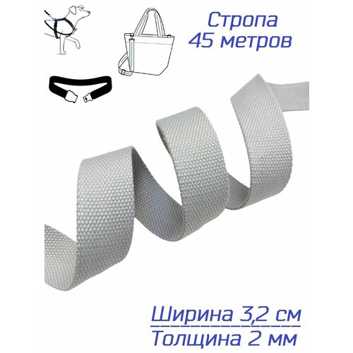 Текстильная лента ременная (стропа) светло-серого цвета, шириной 32 мм изготавливается из круглых, крепких синтетических нитей, которые визуально и тактильно не отличаются от хлопка, поэтому эту стропу часто называют хлопковой, а нитку называют искусственный хлопок, которая обладает свойствами: