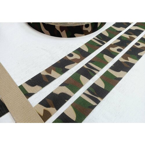 Камуфляжная ременная лента (стропа) бежевого цвета с нанесенным сверху рисунком, шириной 38 мм изготавливается из круглых, крепких синтетических нитей, которые визуально и тактильно не отличаются от хлопка, поэтому эту стропу часто называют хлопковой, а нитку называют искусственный хлопок, которая обладает свойствами: