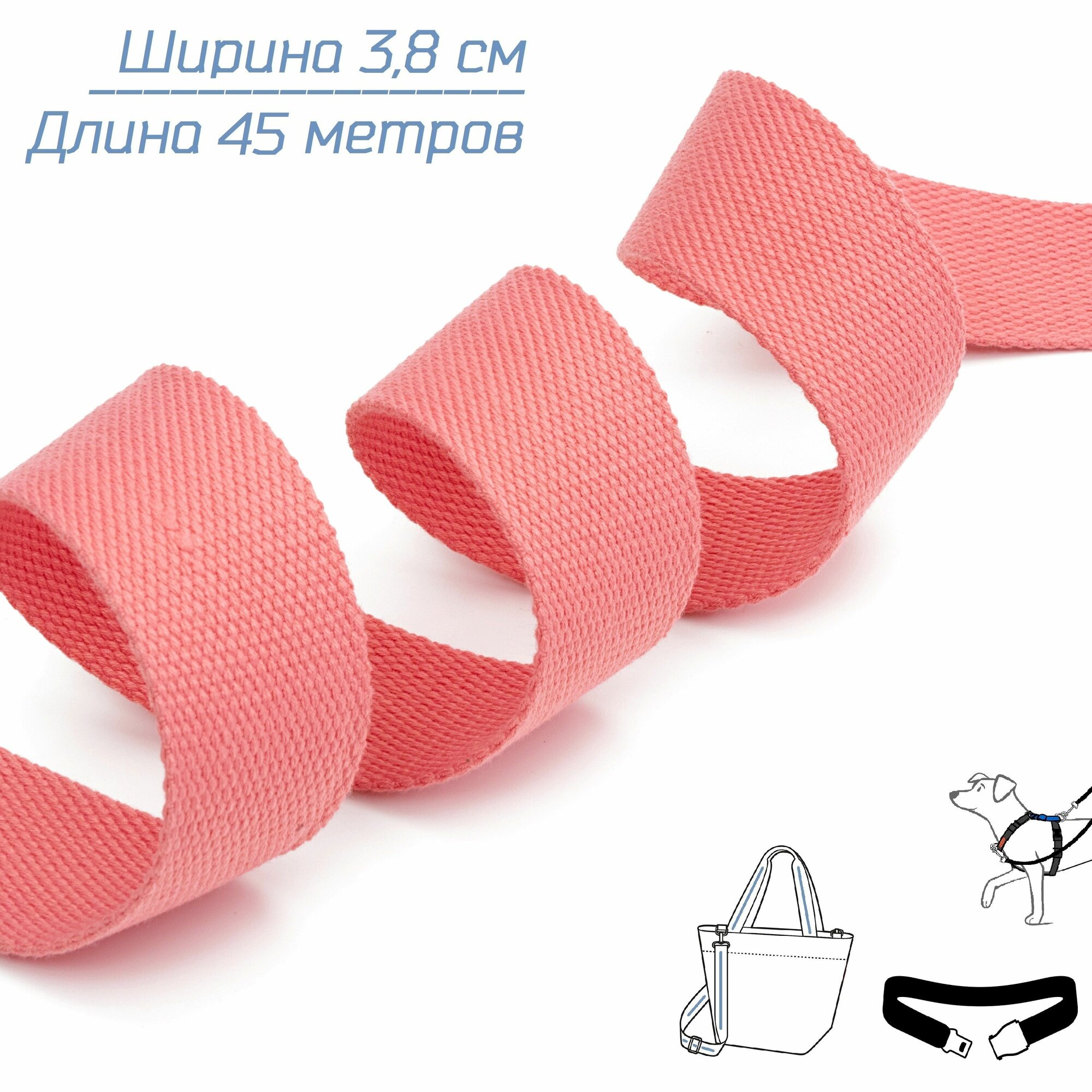 Текстильная лента ременная (стропа) кораллового цвета, шириной 38 мм изготавливается из круглых, крепких синтетических нитей, которые визуально и тактильно не отличаются от хлопка, поэтому эту стропу часто называют хлопковой, а нитку называют искусственный хлопок, которая обладает свойствами: