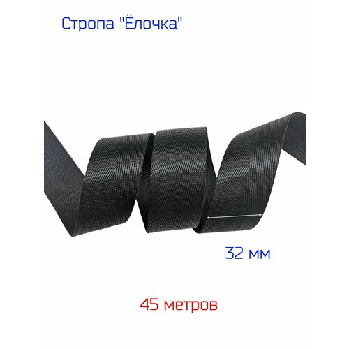 Текстильная лента (стропа) черного цвета и шириной 32 мм с рисунком "Ёлочка" изготавливается из плоских, крепких синтетических нитей стропа обладает высокой прочность и позволяет использовать её как в текстильном производстве где необходимы эти качества, так и в других промышленных областях.