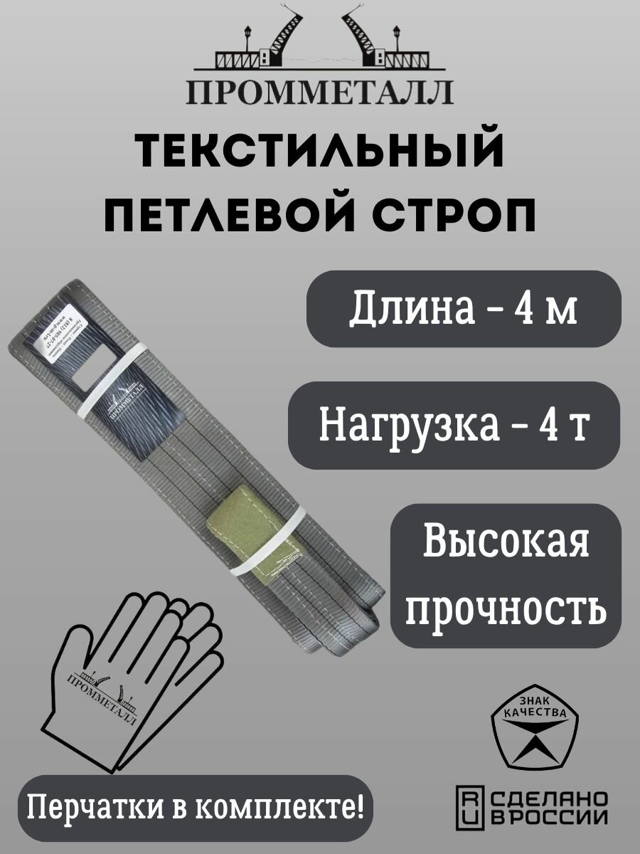 Стропа СТП усиленная - 4тн /4000 от бренда промметалл - это надежный инструмент для подъема и транспортировки различных грузов. Она имеет грузоподъемность до 4 тонн и длину 4000 мм. Данная стропа изготовлена из высококачественного текстиля, что обеспечивает ее долговечность.