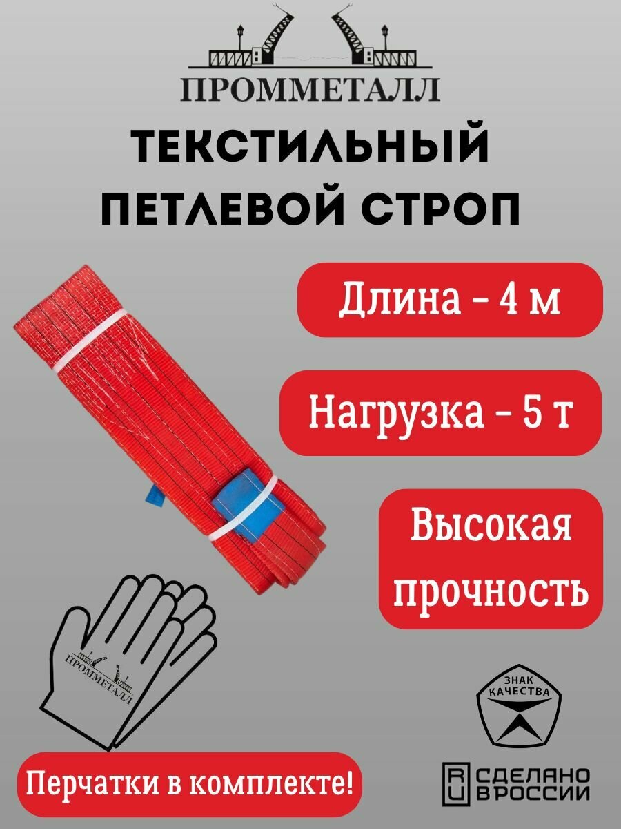 Стропа СТП усиленная - 5тн /4000 от бренда промметалл - это надежный инструмент для подъема и транспортировки различных грузов. Она имеет грузоподъемность до 5 тонн и длину 4000 мм. Данная стропа изготовлена из высококачественного текстиля, что обеспечивает ее долговечность.