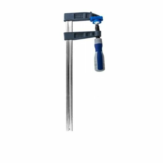 Струбцина F-образная 120х1000мм кобальт 244-612, предназначена для временной быстрой фиксации различных деталей и заготовок между собой или к верстаку для дальнейшей обработки, сварки или склейки. Рейка и винт струбцины изготовлены из углеродистой конструкционной стали с губками из ковкого чугуна. Подвижная губка с винтом скользящая по рейке позволяет производить быстрый захват деталей разного размера для повышения скорости работы. Пластиковые нагубники не оставляют следов на заготовке. Толщина зажимаемых заготовок до 1000мм, глубина захвата 120мм, усилие сжатия 450кгс.
