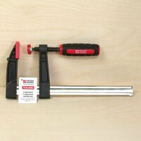 • cтрубцины F-образные из ковкого чугуна WOODWORK со скобами-захватами из ковкого чугуна с рукояткой из двухкомпонентного пластика черного и красного цветов укомплектованы съёмными пластиковыми накладками на прижимные губки