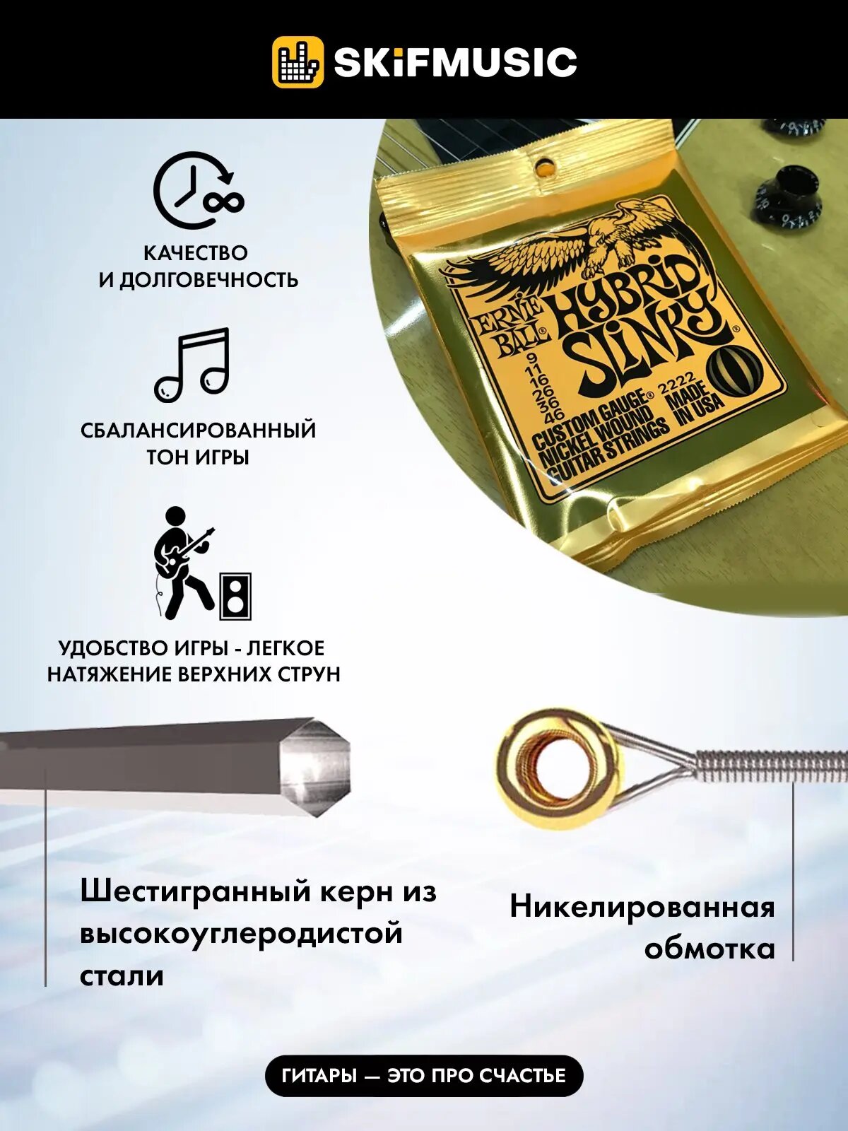 Высококачественное звучание достигается за счет обмотки из никелированной стали. Струны с обмоткой изготовлены из стального шестигранного сердечника, в то время как струны без обмотки - из специально закаленной луженой, высокоуглеродистой стали. Такое решение обеспечивает стабильность, сбалансированность тона и долговечность.