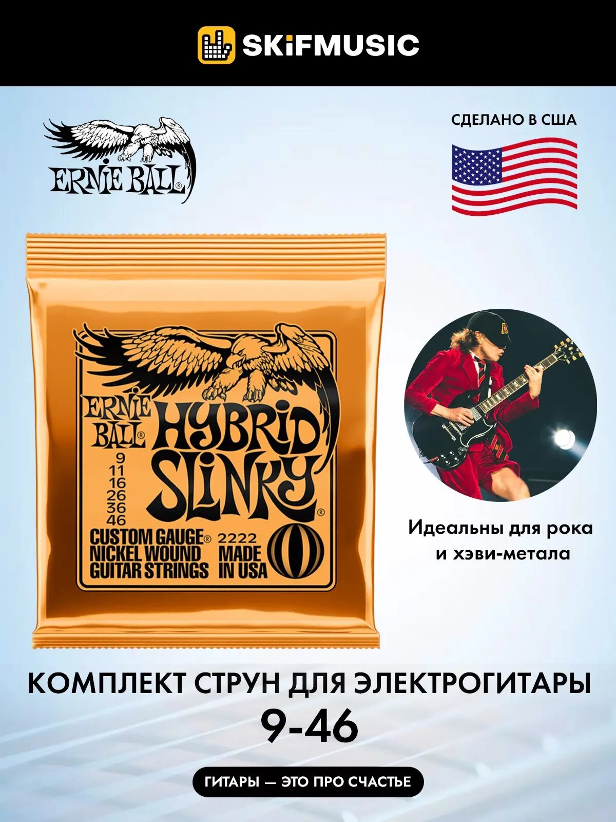 Струны Ernie Ball 2222 серии Hybrid Slinky Nickel Wound для электрогитары идеально подойдут музыкантам, которым нравится звучание струн Super Slinky и Regular Slinky.