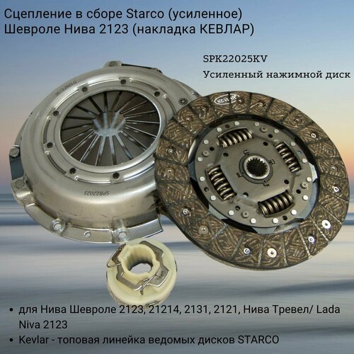 STARCO KEVLAR Оригинальный артикул 21233-1601000 Сцепление в сборе (усиленное) ВАЗ 2123 (Шевроле Нива) (накладка кевлар) SPK22025KV - это усовершенствованная версия базовой модели SPK22501 ORGANIC , позволяющая в полной мере использовать внедорожные способности вашего автомобиля. В отличие от базовой модели, это сцепление из линейки High-Torque Performance имеет больший запас по крутящему моменту, сохраняя при этом плавность выжима, свойственную всем сцеплениям с ведомыми дисками Organic. Тип корзины: лепестковая (диафрагменная) Тип диска: фрикционными кевларовыми накладками Комплектация: Нажимной диск - SPB22501 - 21233-1601085 (1 шт) Ведомый диск - SPD22025KV - 21233-1601130 (1 шт) Муфта сцепления в сборе - ES122331 - 21233-1601080 (1 шт) Комплект перчаток (1 шт) Накладка кевлар - это работа ведомого диска при экстремально высоких температурах (вплоть до 500°С), высокая прочность на разрыв, а также плавное зацепление. С точки зрения долговечности накладки из кевлара служат в 2-3 раза дольше, чем органические накладки, при прочих равных условиях. Кроме того, эти волокна имеют низкий коэффициент статического и динамического трения, что делает их идеальным выбором для применений, где важно плавное сцепление (например, езда по бездорожью, джип-триал и т. д.). Хотя накладки из кевлара более требовательны к состоянию поверхности маховика и нажимной плиты, чем большинство материалов, и имеют длительный период обкатки (500-1000км), их долговечность делает их отличным выбором для автомобилей со стандартными или слегка модифицированными двигателями, а устойчивость к высоким температурам позволяет буксовать или таскать тяжелый прицеп, не боясь выхода сцепления из строя по причине перегрева.